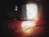 Chronic ocular surface disease (OSD) may lead to corneal neovascularization. Signs of OSD include blepharitis, meibomian gland stenosis, inflammation of the meibomian gland orifices and superficial punctate keratitis with peripheral corneal infiltrates (Fig. 8). Patients with OSD present with burning, foreign body sensation and reduced tear film. These symptoms are frequently worse in the morning because inflammatory mediators have been concentrated in the tear film during the night. Increased tear production during the time after the patient awakens dilutes these chemicals and reduces the symptoms. Treatment of OSD includes scrubbing the lids with baby shampoos or commercially prepared pads, instilling a broad-spectrum antibiotic ointment (Polysporin, Bacitracin) and a regimen of heat and meibomian gland expression. Tetracycline and doxycycline alter the esterification process and cause the oils produced by meibomian glands to be thinner and less prone to plugging the gland orifices.