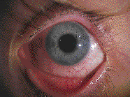 Some patients who overwear their soft lenses or who sleep in lenses not intended for overnight wear may present with frank corneal abrasion or erosion such as appears with hard contact lens overwear syndrome. Other patients may present with symptoms of pain, photophobia, and intense perilimbal injection, but no evidence of frank epithelial abrasion. This condition has been referred to as contact lens acute red eye, or CLARE (Fig. 1). Other associated clinical signs include corneal epithelial edema, conjunctival injection and limbal edema, as well as limbal infiltrates in the peripheral cornea (Fig. 2). The etiology of CLARE is not well understood, but it is believed to be related to the body's immune response to corneal hypoxia. Brien Holden, Ph.D., and others have postulated that the hypoxic corneal epithelium produces a substance that leads to inflammation and leukocyte infiltration. The breakdown of any cell membrane releases membrane phospholipids that are converted into arachidonic acid. This is then converted into prostaglandins by cyclooxygenase and leukotrienes by lipoxygenase. Prostaglandins, particularly PGE2, lead to inflammation, and leukotrienes are chemotactic (attract leukocytes). This may be the final common pathway.