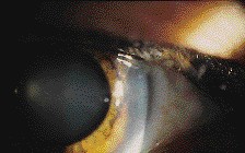 Epithelial splitting (Fig. 3) is a form of noninfectious keratitis that occurs just inside the superior limbus. Like CLARE, its etiology is not well understood, and it is also believed to be due to chronic hypoxia. In a non-contact lens wearer, the superior cornea is hypoxic relative to the cornea within the palpebral aperture because the upper eyelid limits the amount of oxygen available to the cornea beneath it. While this is not a problem for most contact lens wearers, some develop persistent linear staining circumferential to the upper limbus. Differential diagnosis includes a superior limbic keratitis, chlamydial keratitis (adult inclusion keratitis) and corneal abrasion.