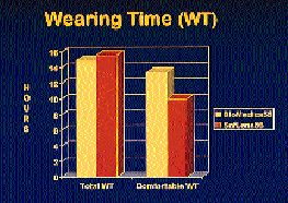 Patient comments were also telling. Six patients reported discomfort with the SofLens66, five reported excessive movement and three complained of poor vision. Five patients felt that SofLens66 handled poorly compared to the Biomedics55, and four reported that the SofLens66 was less comfortable or performed differently in one eye compared to the other. Table 2 and Figure 2 illustrate average wearing time and length of comfortable wear.