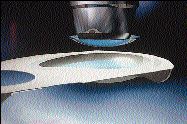 The high-precision molds are a key element of the Lightstream process (Fig. 1). The lens geometry is incorporated in the mold surfaces -- a significant engineering feat. The manufacturing process is divided into modules, with each module enclosed in a laminar flow cabinet. The complete manufacturing process is fully automated, from the nelfilcon A polymer being metered into the molds to the lenses emerging in strips of five blister packs ready for autoclaving. In-process inspection of finished lenses is computer-controlled. Batches are sampled in the traditional method for volume production.