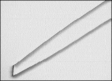 The water soluble nelfilcon A polymer is cross-linked in the mold by exposure to ultraviolet light which is restricted to the area within the mask. The surrounding polymer which is not cross-linked is then washed away with purified water, forming the edge. A thin edge profile, designed to minimize lid awareness, is defined by the three-dimensional shape delineated by the shadow of the ultraviolet lightstream at the edge of the mask and the cavity between the two mold surfaces. Figure 2 illustrates a typical edge profile. After cross-linking, the mold carrier is opened and the lenses are removed from the molds by vacuum grippers. Every lens is inspected for defects by an automated, computer-controlled process. The molds on their carriers are cycled continuously around the production module. When the lenses are removed prior to packaging, the molds are washed with water and go around again. The production modules are enclosed in environmentally controlled cabinets. The lenses are deposited in blister packs which are filled with a metered amount of saline and sealed, all within an environmentally controlled enclosure. The strips of five blister packs are fed from the production module to the sterilization area, packed in 90-lens packages and labeled.