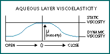 As noted earlier, Drs. Eiden and Schnider found that all 15 of the patients they had identified as prone to RGP daily wear lens adherence showed evidence of dry eye. Dry eye is characterized by a thinning of the tear film and increased tear viscosity. Tear film thinning moves the lens closer to the cornea, increasing the distance-sensitive adhesion forces of intermolecular attractions and dipole-dipole interactions. The excessive tear evaporation of many dry eyes causes the tear film to become hypertonic, which increases the viscosity of the tear film. Increased viscosity increases resistance to movement. The aqueous layer of the tear film also demonstrates variable viscosity with shear thinning. This means that the stasis of the closed eye environment causes glycoproteins in the tear film to form weak connective fibrils, which can cause a five- to six-fold increase in viscosity (Fig. 5).
