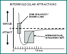 Atoms and molecules exhibit attractive forces to other atoms and molecules that are within a one-nanometer (nm) distance, though the distance varies somewhat with different substances. Within this attraction zone, the attractive forces increase by the reciprocal of the distance to the sixth power (1/d6). When the distance closes to about 0.3nm, the intermolecular forces reverse to become a powerful repellent force. Figure 3 demonstrates the force plot of a typical material. Explained by quantum mechanics, intermolecular attractions occur essentially because electrons don't like to be confined to the same small space. The rapid motion of electrons causes instantaneous fluctuations in the charge density around the nucleus. These charge fluctuations produce an overall small electrical charge, which causes the atom or molecule to attract and orient toward the opposite charge area of another molecule. Although these intermolecular forces are capable of providing adhesion, it seems unlikely that the contact lens would often come within one nanometer of the cornea. Other forces must be considered.