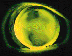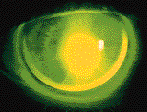 FIG. 5: Fluorescein pattern of a rigid lens on a keratoconic cornea. Note