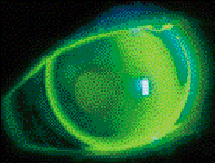 Slit lamp evaluation with both cobalt blue illumination and a Wratten or Tiffen filter will dictate the amount of change in base curve radius that's required. A slight apical clearance fitting relationship will often be present. The base curve can then be changed in 0.50D to 1.00D steps until apical bearing is first observed. At this time, a "three-point touch" or "bull's eye" fitting relationship should be present (Fig. 1).