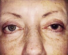 Figure 1: Cosmetic benefits using a Custom Color Contact prosthetic lens for an eye scarred from a childhood injury of a pencil stuck in the