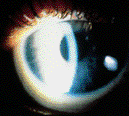 Other potential risks with RGP extended wear involve the fitting characteristics of the lens. One of the more serious complications is lens adherence, characterized by a non-mobile lens upon awakening. Although the incidence of clinically significant lens adherence ranges between 10 to 22 percent, the consequences can sometimes lead to corneal distortion or even ulceration. Like corneal edema, actual lens adherence is often undetected by clinicians unless examinations are performed soon after awakening. However, lens adherence may cause a characteristic inferior arcuate staining pattern, and the astute clinician will discover this subtle finding with careful slit lamp examinations.