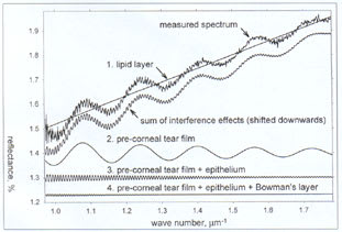Figure 1. Measured reflectance spectrum from tear film and cornea, showing contributions from four interference effects (32-year-old white