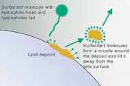 Surfactants Surfactants are chemicals that reduce the surface tension of solutions to facilitate debris removal from lens surfaces, usually in conjunction with digital rubbing. In essence, the amphipathic nature of surfactants (hydrophilic head and hydrophobic tail) utilizes ionic charges to displace deposits from the lens surface (Figure 3). When used properly, surfactants help remove loosely bound oils, mucous and debris. Common surfactants include Poloxamine, Poloxamer, Pluronic and Tetronic.