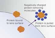 Figure 5. Protein removers such as Hydranate and Citrate use ionic charges to pull protein molecules from the lens surface. |