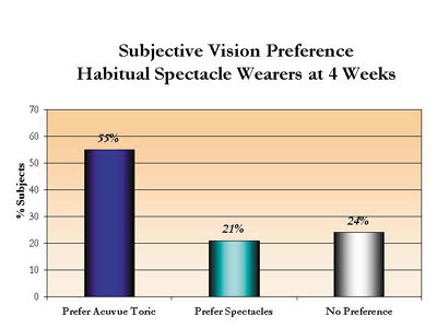 The study results revealed that Acuvue Toric lenses provided improved visual acuity over habitually-worn spherical contact lens correction and similar acuity to spectacle lens wear. Subjectively, habitual spherical soft contact lens wearers found Acuvue Toric lenses provided superior vision and reduced visual symptoms such as ghosting, halos, fluctuating vision and glare. Such symptoms are often very troublesome to patients but do not necessarily show up in a standard eye examination where the general measure of vision is Snellen visual acuity. However, subjects may attain a good level of visual acuity in the examination room but experience uncomfortable visual disturbances in other conditions such as driving at night, using a computer, etc. The reduction in visual symptoms, accompanied by improved acuity experienced by subjects when fit with Acuvue Toric, is a good indication of the visual improvement this lens provides for low astigmatic subjects.