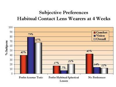 Vision and comfort were both statistically significantly better for the Acuvue Toric contact lenses compared to the subjects' habitual spherical soft contact lenses (p<0.0001 and p<0.03 respectively) at both the two- and four-week follow-up visits. No statistically significant difference was shown for lens handling or orientation.