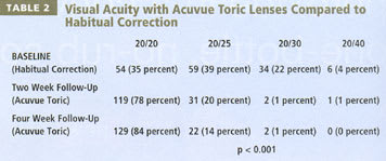 Table 2 summarizes Snellen visual acuity results for the entire subject group and indicates that at baseline, only 35 percent of all eyes achieved 20/20 vision with their habitual correction. At the two- and four-week follow-up visits, 78 percent and 84 percent respectively of eyes corrected with Acuvue Toric lenses achieved 20/20 vision. Acuvue Toric lenses provided a statistically significant (p<0.001) improvement in Snellen visual acuity at both the two and four week study visits, when compared to the subjects' habitual vision correction.