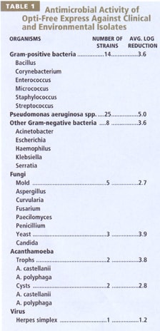 In the real world, contact lens disinfecting products may be subjected to a variety of potential pathogens. Beyond the representative FDA and ISO test organisms required for clearance to market, effectiveness against a broad range of microbes helps to insure patient safety. To explore its spectrum of activity, Opti-Free Express (10 ml) was challenged with 0.1 ml of approximately 1x108 CFU/ml using 60 different isolates. The final concentration of the micro-organisms in the product was approximately 1x106 CFU/ml. The isolates included 60 different species of Gram-positive and Gram-negative bacteria, yeast, mold, Acanthamoeba spp. and virus. Given the significance and relation to contact lens-related infection, 25 different strains of Pseudomonas aeruginosa, including both cytotoxic and invasive strains, were tested. Other products were not tested because of the magnitude of the study. Results are shown as log reduction at the label disinfection time (Table 1). The results confirm that Opti-Free Express has a high level of antimicrobial activity against numerous clinical and environmental isolates.