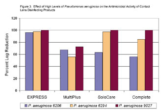 Figure 3. Effect of high levels of Pseudomonas aeruginosa on the antimicrobial activity of contact lens disinfecting products. |