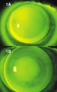 The amount of eccentricity can vary greatly among aspheric posterior surface RGP multifocals, depending on design philosophy. Figures 1a and 1b both present RGP aspheric multifocals that generate approximately 2.00D of add power. Note the significant difference in their fluorescein patterns. Figure 1a shows a bi-aspheric lens design with a low eccentricity optic zone combined with an adjacent hyperbolic curve. Figure 1b shows a high eccentricity design that rapidly flattens from the central apical radius towards the periphery. At first glance it is hard to believe that they are from same category of lens design, yet both are worn successfully by patients with similar presbyopic needs.