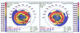 The third patient was a 30-year-old college student who has moderate to high myopia. Her refractive changes with the Vipok lenses occurred very quickly (Table 1), and she was pleased with her unaided vision. This patient required only one lens change to improve lens centration. She currently wears the lenses only at night and functions without any lens wear during the day. She maintains good unaided vision for up to 16 hours daily. Figure 3 shows the corneal topography of her right eye before treatment and after three days of treatment.
