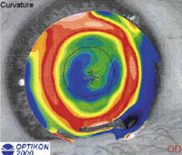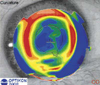 | Figures 5 and 6. Topography OD before epithelial debridement (left) and three weeks later (right). Note the improvement of the central corneal regularity. | |