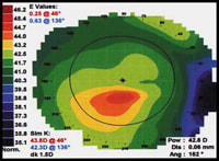 The early data indicate that thickening of the central cornea accounts for half of the overall change while thinning under the knee accounts for the other half. Before and after topography (Figures 2 and 3) demonstrates the central steepening that provides the correction for hyperopia.