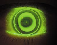 Figure 1 shows the fluorescein pattern of an astigmatic reverse geometry lens (RGL). It's not a bitoric lens in the true sense of the word because the relationship between the flat and steep meridian is variable. The reverse curves are also variable and, unlike a true bitoric, don't have a constant relationship to the base curves. Note the difference in tear layer thickness between the meridians and the oval central "touch" area.