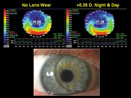 | Figure 1. Corneal mapping of the patient's left eye without a contact lens (left) and with a +0.25D Night & Day lens (right). |