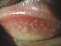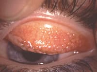 GPC patients frequently present with coated lenses that position under the lid and move with every blink. Lid eversion typically reveals papillae covering the tarsal surface (Figure 3). In long-standing GPC, scarring of the tops of the lesions appears clinically as white, rough aspices. GPC may present as bilateral, unilateral or asymmetrical.