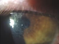 Release of highly basic proteins can result in superficial punctuate keratitis, corneal neovascularization or a sterile shield ulcer. These lesions are susceptible to secondary bacterial infection including haemophilus influenza. Horner-Trantas dots may occur with AKC, but not as frequently as they occur in VKC. Long-term inflammation can result in significant vision loss. In advanced disease, patients may also develop anterior and posterior shield cataracts.