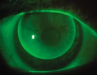 At the dispensing visit, she was a little unsure about the initial lens awareness but claimed that her vision was better than with any lenses she'd tried before (20/15 OU) and even better than with her glasses. The lenses fit well (Figure 1) with even alignment and good lid attachment. We taught her application and removal and lens care techniques, then scheduled her for a follow-up visit a week later.