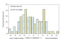 Figure 2. Frequency distribution graph of orientation for two soft toric contact lens designs. |