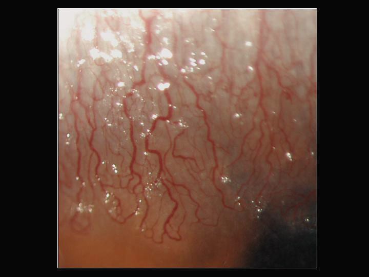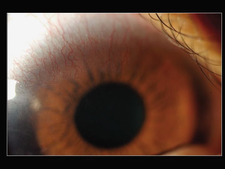 Slit lamp examination of the symptomatic left eye showed mild superior bulbar inflammation as well as significant superior neovascularization with lipid leakage (Figures 1 and 2). The superior corneal epithelium was irregular with small, elevated gelatinous nodules adjacent to the areas of neovascularization (Figure 3). We also noted significant punctuate staining confined to the superior one-third of the cornea.