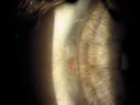 Case 1, Visit 2 Our patient cancelled her first appointment and returned two weeks later, reporting less redness and no irritation OS. The large corneal infiltrate showed significant improvement, was mildly elevated, had trace staining and was vascularized throughout. We noted a small intracorneal hemorrhage at this visit (Figure 2). We instructed the patient to continue the ocular lubricant and to discontinue the steroid. We advised her to return in one week for a comprehensive examination and contact lens fitting.