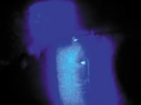 A 19-year-old college student first presented to our practice with complaints of left eye blur, photophobia and irritation of four-days duration. He discontinued GP contact lens wear with the onset of symptoms. He hadn't seen his previous eyecare practitioner in four years. The right GP contact lens was four years old, and he'd replaced the left GP lens three months prior after breaking it. The original practitioner hadn't evaluated the contact lens fit or ocular health in four years and sent the new GP lens without a health assessment. The patient had worn the contact lenses on an overnight bus trip five days earlier and experienced some irritation the following day. Slit lamp examination revealed a 0.5mm superior-central infiltrate with overlying stain on the left cornea (Figure 4). Visual acuity with spectacles was 20/15 OD and 20/50 OS. Pinhole acuity was 20/30 OS. We presumed that the infiltrate was a sterile corneal ulcer because of the lack of anterior chamber reaction, significant pain or photophobia after four to five days of onset. We prescribed a fourth-generation fluoroquinolone and instructed the patient to return the following day.