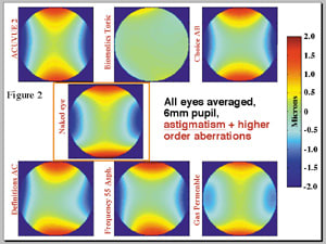 Several anecdotal clinical accounts also exist of aspheric lenses "masking" low to moderate amounts of corneal astigmatism (Patel et al, 2004). Such masking of astigmatism is optically possible (yet unlikely) only if the lens doesn't completely conform to the corneal surface and creates a tear lens, similar to a GP lens. Using the same aberrometry technology, we also examined the ability of aspherics to correct low levels of astigmatism.