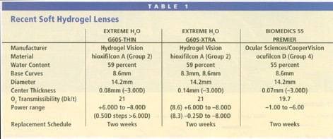 Extreme H2O (hioxifilcon A, Hydrogel Vision Corp.) Many of you may know about Extreme H2O because it's been on the market for several years. However, this lens is now available in two options: G60S-thin and the new addition, G60S-Xtra. Table 1 provides the specifics of both lenses for a side-by-side comparison. The Extreme H2O contact lens is indicated for patients who have dry eye or who experience lens-induced dry eye, particularly toward the end of the day.