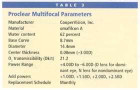 Another advantage of this lens is that CooperVision has incorporated the same design it currently uses in its Frequency 55 Multifocal lenses. Table 3 lists the lens parameters. They're available in D lenses (center distance zone, aspheric intermediate zone and spherical near periphery) for the dominant eye and N lenses (center near zone, aspheric intermediate zone and spherical distance periphery) for the nondominant eye. Combining the near-centered and distance-centered lenses can create a more balanced visual state between the two eyes. We've found that this lens has proven advantageous for patients who can barely survive the discomfort of their contact lenses; by switching them to the Proclear Multifocal, most have become truly successful lens wearers.