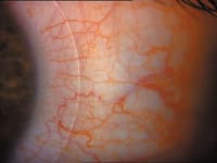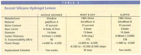 Silicone hydrogel lenses became commercially available in 1998. Silicone rubber is highly oxygen permeable. However, it's also inherently hydrophobic, so lenses made of pure silicone tended to accumulate lipid deposits. To solve this problem, manufacturers combined silicone and conventional hydrogel materials, resulting in contact lenses that are highly oxygen permeable and have increased wettability and less affinity for lipids. Silicone hydrogel lenses have also nearly eliminated hypoxic complications (such as contact lens red eye, microcystic edema and the long-term effect of corneal neovascularization) (Figure 1) that commonly occur with traditional hydrogel materials, particularly in extended wear patients. Table 2 summarizes the parameters of three commercially available silicone hydrogel lenses.