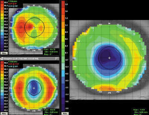 Figure 2. The subtractive map shows the change in astigmatism. Note the increased flattening of the steep meridian (horizontal) and the oval treatment zone in the lower left plot. |