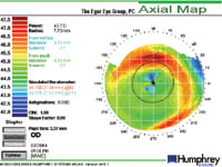 In two weeks, TB returned to the office complaining again of poor vision OD. Both eyes were white and quiet. His lenses weren't everted in either eye. Corrected distance vision OD was now 20/40 as compared to 20/20 when we dispensed the –6.00D lens, and a spherical over-refraction of –1.00D OD produced 20/20 vision. A repeat of his topography revealed no abnormalities in either eye, and closely matched earlier findings from before this incident.