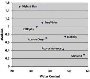 In silicone hydrogels, the relationship between water content and modulus is fairly linear as traditional theory dictates. Figure 1 shows this relationship.