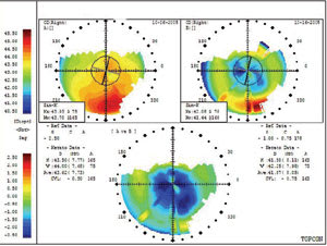 | Figure 3. Difference map of lens-induced corneal warpage. Notice the change in corneal appearance and refraction over three weeks time. This patient had been wearing a large diameter, tight-fitting soft toric lens. |