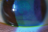 It's also important to differentiate between fluorescein staining on the cornea and fluorescein pooling. If there's a depression in the cornea but the epithelial cells are intact, the fluorescein will pool in the depressed area. A classic example of this is dimple veiling, in which small bubbles trapped under a GP lens make several round impressions in the cornea that fill with fluorescein.