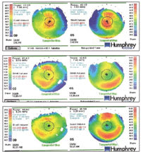 Figure 1. Corneal topographies of patient AB, top) Pre-VST; middle) One day Post-VST; bottom) One week Post-VST. |