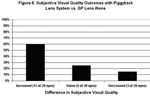 Visual Outcomes Seventeen (85 percent) of these eyes fit with piggyback lens systems experienced the same or better Snellen visual acuity. Figure 3 compares subjective visual satisfaction one month after successfully wearing the piggyback lens system. Seventeen of 20 eyes (85 percent) had improved visual quality with the piggyback lens system vs. their previous GP lens alone. Using a scale of 1 to 10 on the patient questionnaires, the mean pre-fitting subjective visual quality rating was 8.05, which improved to a 9.00 mean visual quality rating one month after the piggyback fitting.