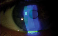What's new in this area? Over the past few years, Korb et al coined the term "lid wiper epitheliopathy" (Figure 3) to represent staining of the anterior superior tarsal conjunctiva, which is highly associated with symptomatic contact lens wear. To evaluate this staining, instill fluorescein and lissamine green in the eye in a sufficient quantity to cover the ocular surface. Then evert the superior lid and evaluate for staining. Grade the horizontal length and the width of the staining, with a grade 2 representing approximately 50 percent staining of the "lid wiper" area (a staining pattern of approximately 6mm x 1mm coverage). Although studies using different treatment regimens haven't utilized this as an outcome measure, if you do see this staining pattern in symptomatic patients, you should monitor it for possible improvement with changes in the management plan.