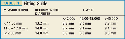 The fitting process for this custom lens is different from most modern lenses. Due to safety concerns surrounding the re-use of diagnostic lenses on different patients, trial fitting sets won’t be available. Instead, you fit the initial lens empirically. This may seem daunting if you’ve spent decades using diagnostic lenses before making a final order, but a fitting guide (Table 1) is available to help the decision process.