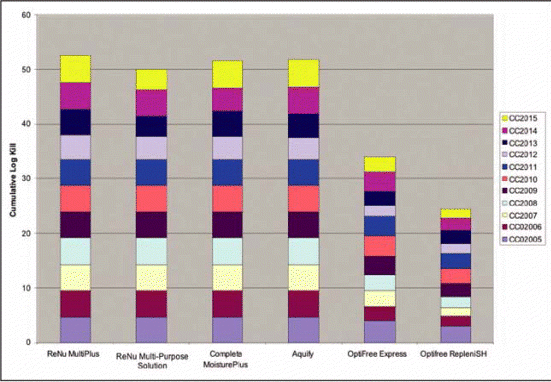 ReNu MultiPlus, ReNu Multi-Purpose Solution, Complete MoisturePlus and Aquify demonstrated efficacy that far exceeded the minimum acceptance criteria of 3-log reduction for the required strain and demonstrated an equally impressive kill of the clinically collected strains.