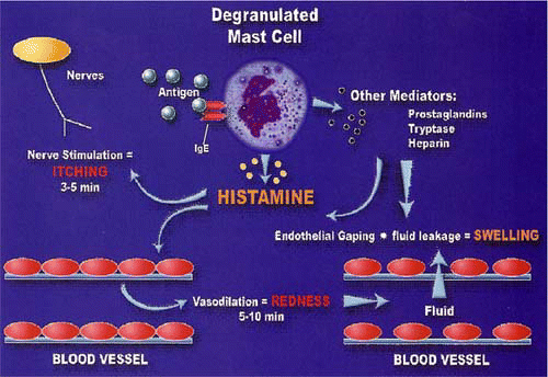Active ocular allergy is a specific and narrowly focused form of ocular inflammatory disease. The primary cell involved is the mast cell, of which there are some 50 million in the human eye. During allergic episodes, mast cells move or migrate to the superficial tissue layers where they are degranulated by immune or mechanical stimuli. Once degranulated (Figure 1), histamine, the principal mediator of allergic conjunctivitis, releases into the blood stream and causes vasodilatation and erythema, increased vascular permeability (edema) and neural stimulation (itching - the hallmark of allergy) (Figure 2).