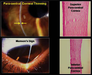 When you view an eye that has advanced keratoconus in optic section, the central or paracentral corneal thickness can be onethird that of the peripheral cornea (Figure 1). Due to the excessive corneal curvature, it may be difficult to keep the entire section in exact focus at one time. In the later stages of the condition, the resulting ectasia can result in Munson's sign, the angular curve present at the lower lid margin when the patient looks down.