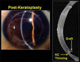 OCT is a new anterior segment viewing technique recently introduced in the Visante (Carl Zeiss Meditec, Inc.), which uses a time delay of back scattered light to view the anterior segment of the eye. Our patient's OCT showed the preoperative, inferior corneal thinning, but it also showed the thickness of the transplanted cornea, which jettisoned out into the anterior chamber (Figure 2).